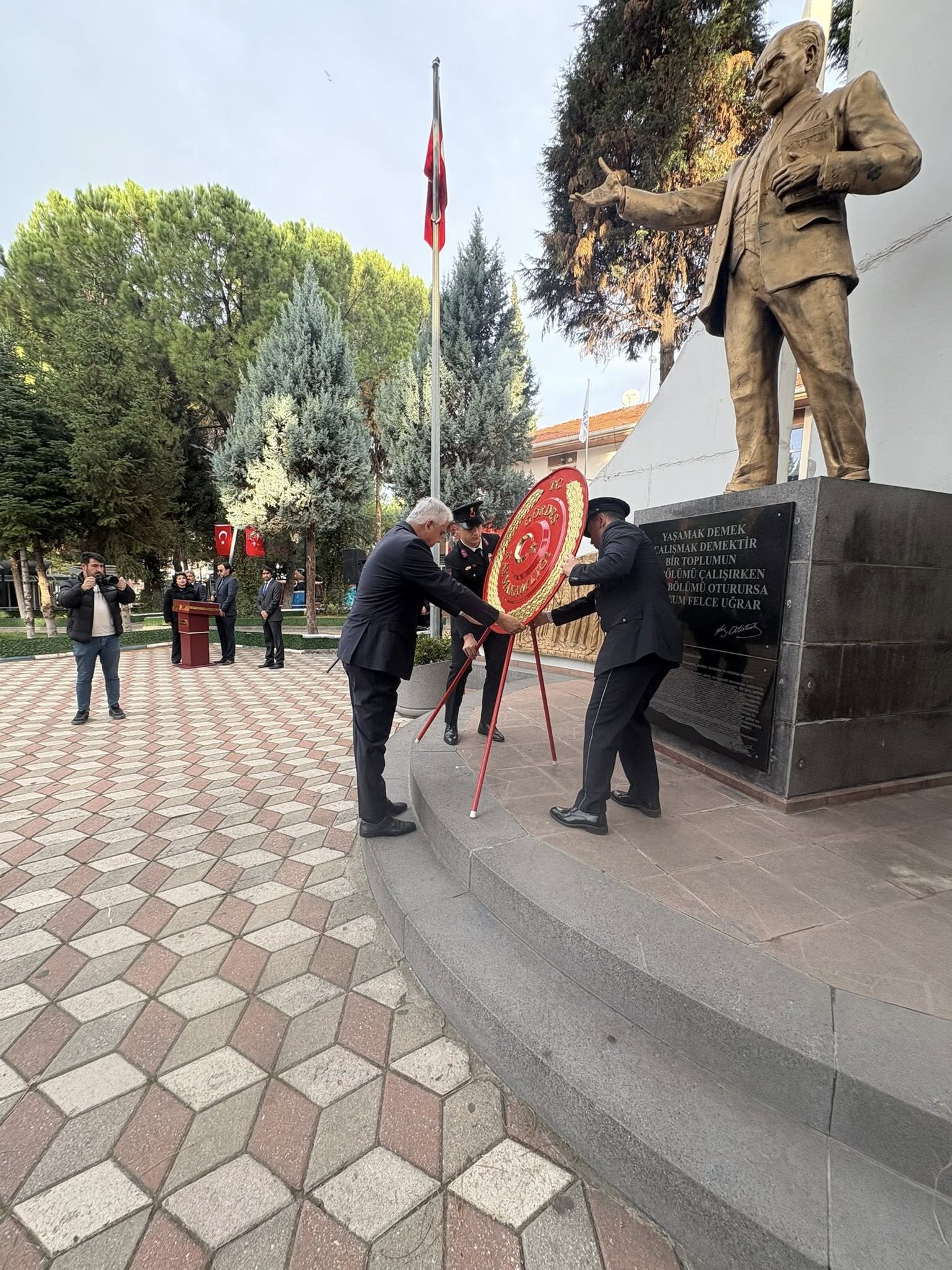 Çelenk sunumunun ardından katılımcılar, Cumhuriyetimizin kurucusu Gazi Mustafa Kemal Atatürk için saygı duruşunda bulundu ve İstiklal Marşı okundu. Törenin devamında Belediye Kültür Sarayı’nda anma programı gerçekleştirildi. Programda, Atatürk’ün hayatı, ilkeleri ve Türk milletine kazandırdıkları üzerine sunum ve gösteriler yer aldı.