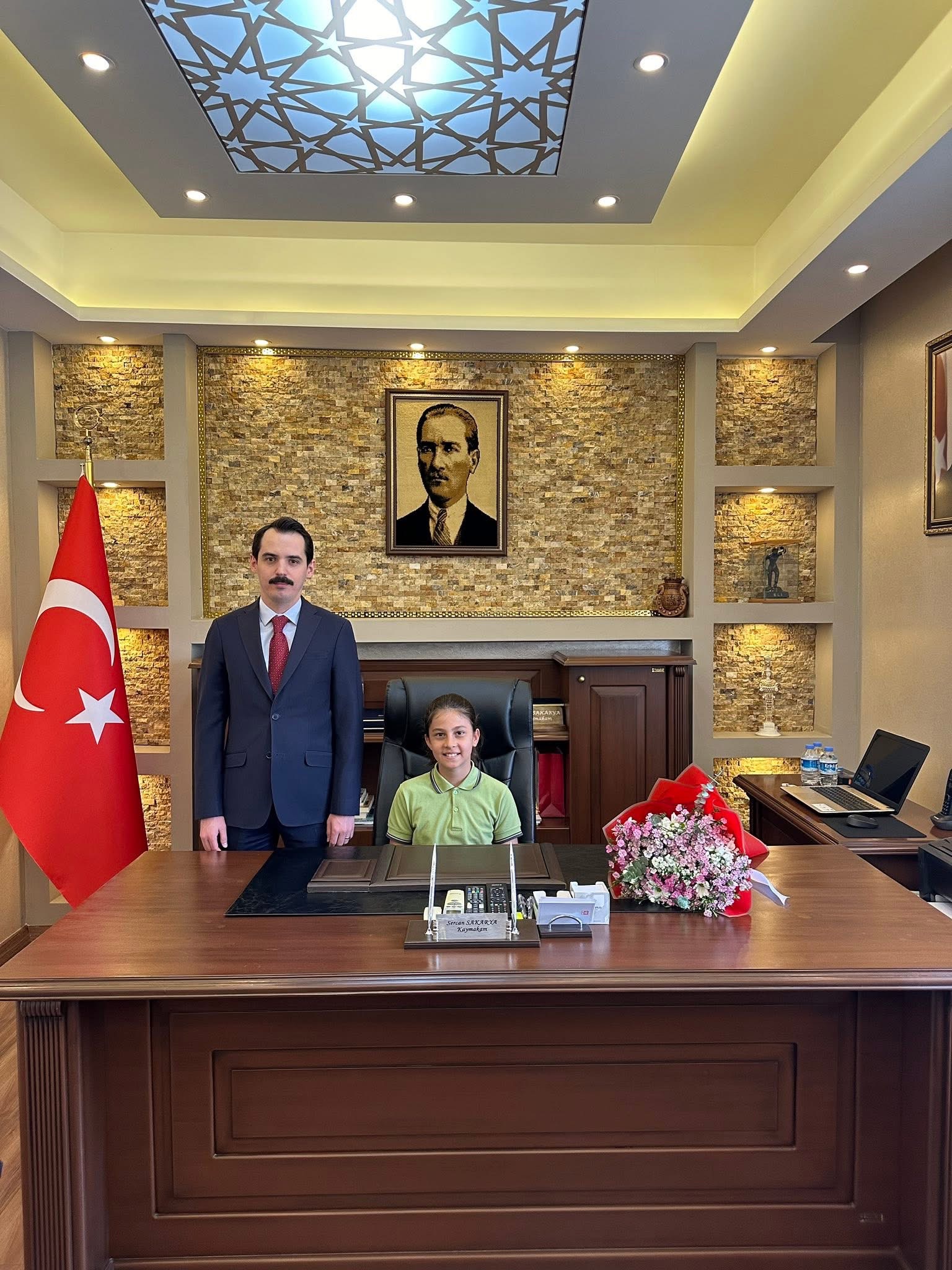 23 Nisan Ulusal Egemenlik ve Çocuk Bayramı kapsamında Beş Eylül İlkokulu öğrencilerinden Ebrar İnci Deniz, Kaymakam Sercan Sakarya’nın makam koltuğuna oturdu.