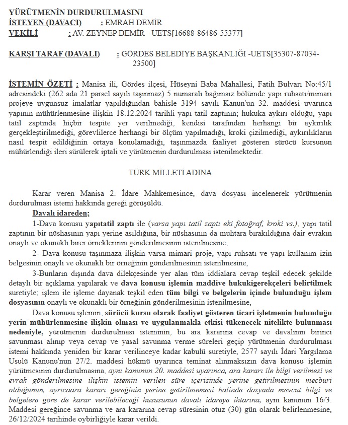 Gördes’te uzun yıllardır faaliyet gösteren Emrah Sürücü Kursu, 18 Aralık 2024 tarihinde Gördes Belediyesi tarafından mühürlenmişti. Konuyla ilgili olarak işletme sahibi tarafından açılan dava, Manisa İdare Mahkemesi’nde görülmüş ve mahkeme 26 Aralık 2024 ve 15 Ocak 2025 tarihlerinde iki ayrı yürütmeyi durdurma kararı vermişti. Bu kararlar doğrultusunda yaklaşık 40 gün kapalı kalan sürücü kursu yeniden açılmıştı.